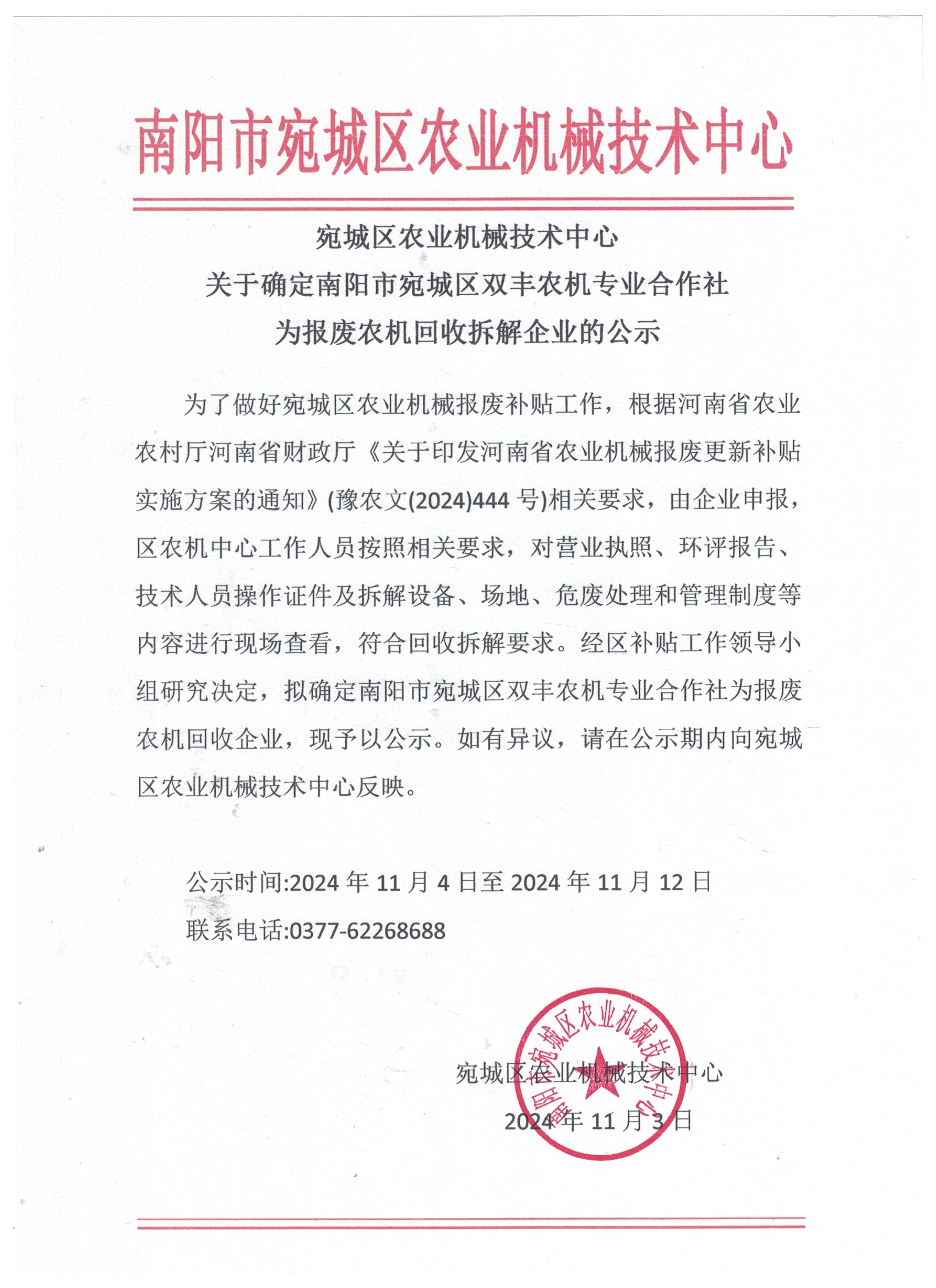 宛城區(qū)關(guān)于確定南陽(yáng)市宛城區(qū)雙豐農(nóng)機(jī)專業(yè)合作社 為報(bào)廢農(nóng)機(jī)回收拆解企業(yè)的公示.jpg